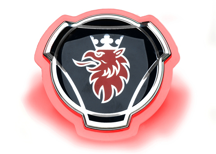 Waterproof Scania Emblem with LED Border Made of Opaque White Acrylic The 3-Meter Cable is now attached to the Base via a Strain Relief Available in Multiple Colors