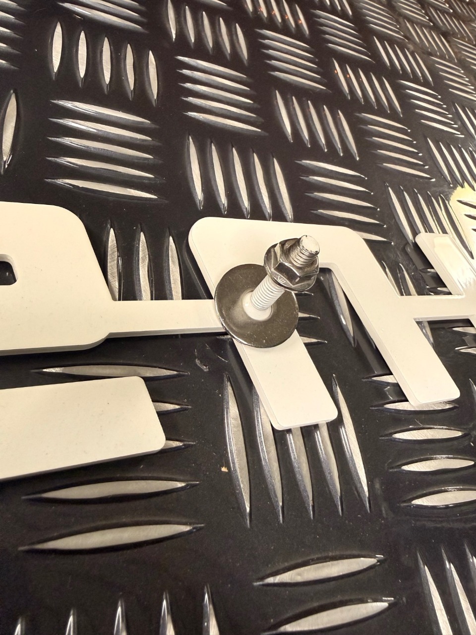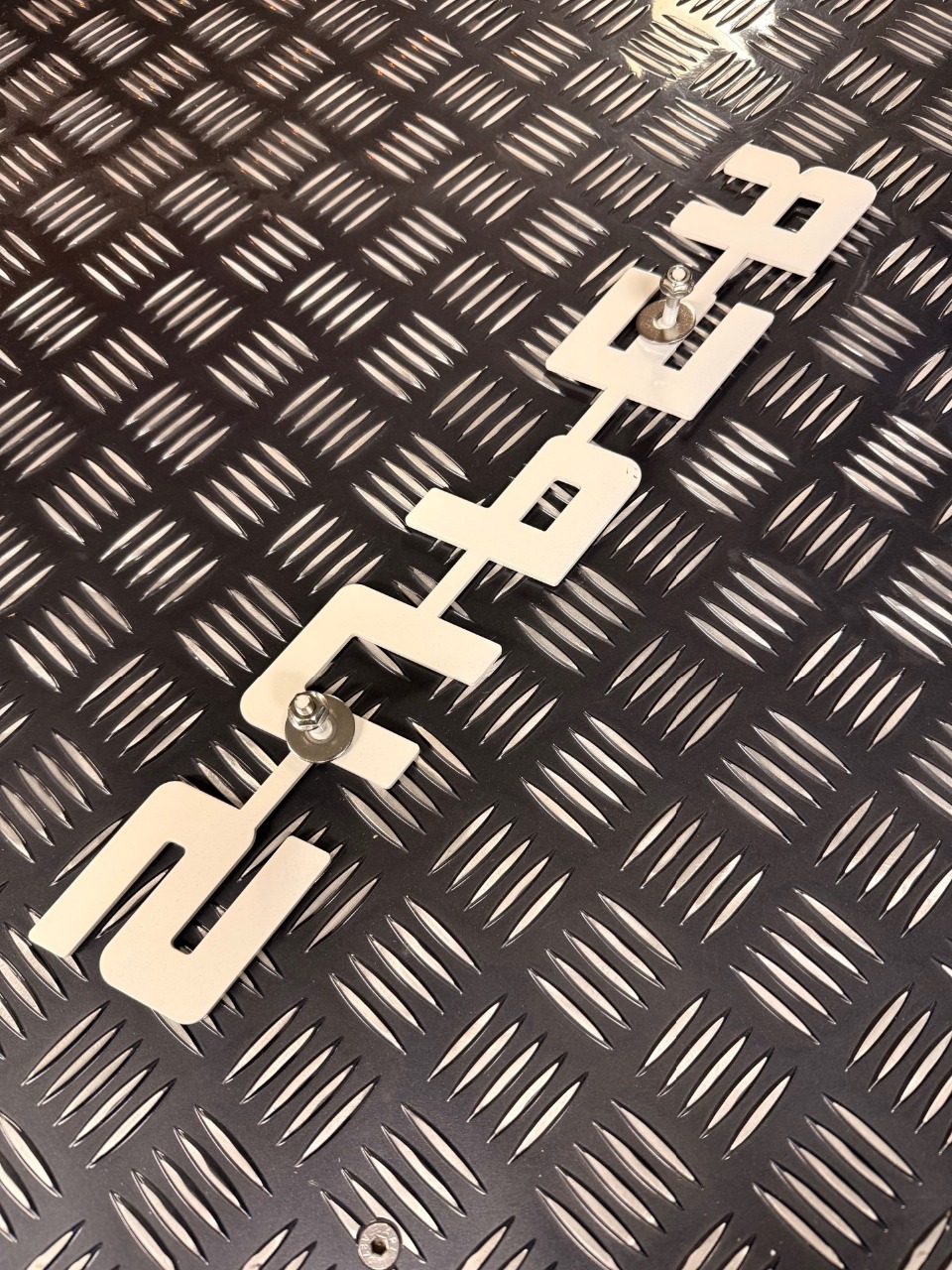 S-U-P-E-R Schriftzug aus 3mm Edelstahl und M6 Gewindebolzen gepulvert in weiß mit Klarlack