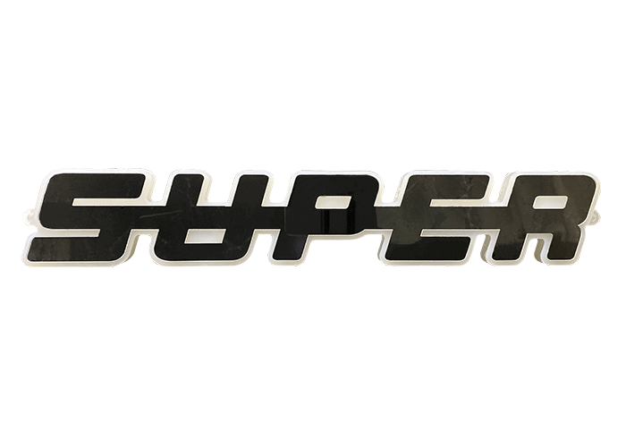 SUPER logo LED 24V with stainless steel front Dimensions 420x65x13mm Available in White, Red or Amber / Orange Mounting: 2 screws (included)